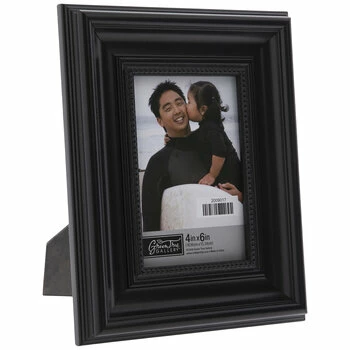Fill your home with photos of cherished memories, friends, family, and more! Black Beaded Beveled FrameΒ boasts a plastic construction with a glossy black color, ornate beveling that leads to beaded trim around the photo opening, and an MDF photo back. Plus, its clear glass screen will display and protect your chosen photo. Set it out on a shelf or a mantel for a fantastic way to fill your space with sentiment!