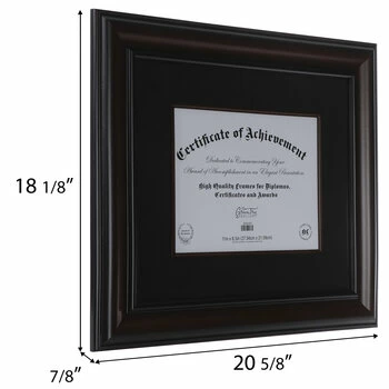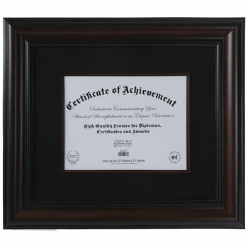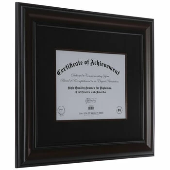 Display your achievements! Black & Brown Wood Document Frame is made of MDF in a rectangle shape. The frame has a black and brown wood look frame, a glass front, a rectangle black mat, and then a thin interior brown mat. Place an award, diploma, document, or degree inside the glass, and hang it up for all to see.