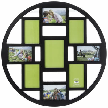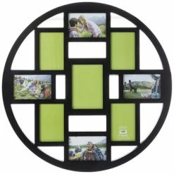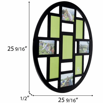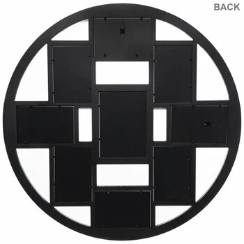 Put your finest memories on display! Black Circle Wood Collage Wall Frame is made of MDF and glass in a circle shape. There is a thick, circle-shaped frame, but on the inside, there are cutouts between the nine rectangle-shaped photo openings. There are eight photo openings of the same size and a larger photo opening in the center. Place family vacation, wedding, baby, and more themed photo sets inside!