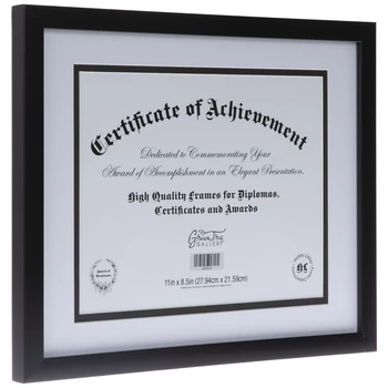Commemorate your certificate, award, or diploma with an elegant presentation using Black Flat Document Frame! This plastic frame boasts a flat, glossy black surface, a clear glass screen, a layered white mat with a black fillet, and an MDF photo back. Fill out your room or office with a professional addition!