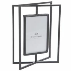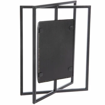 Add a fun new twist to your collection of frames with this Black Geometric Metal Frame! This three-dimensional table frame has a black metal body with glass. The frame is connected to crossing welded stands that form rectangular, geometric outlines. It looks like the photo hangs suspended between the rectangles. Set it out on your mantel or coffee table with your favorite memory for a modern, yet heartwarming accent!