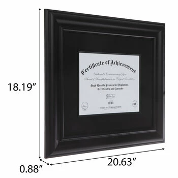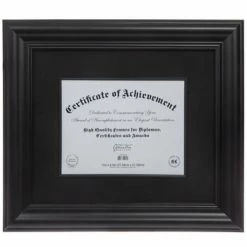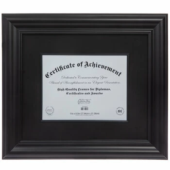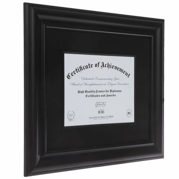 Showcase your accomplishment with this Black Matted Scoop Document Frame! This glossy black plastic frame has an MDF backing, rounded bevels, and a scoop design. Behind its protective glass screen, there is a solid black mat with a bevel directly around the opening. Put your important document on display!