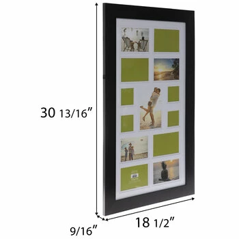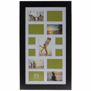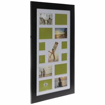 Keep it simple and let your memories stand out on their own with this Black Wood Collage Wall Frame! This MDF and glass frame boasts thirteen openings with a crisp white mat to accentuate each photo. The outer frame is glossy and black with a flat profile. Hang this on your wall with curated photographs for a delightful gallery contained within a single frame!
