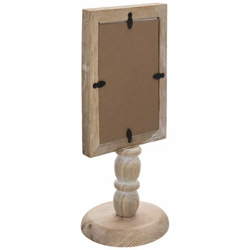 Complement your rustic, farmhouse aesthetic by displaying a photo in this Distressed Pedestal Wood Frame. This MDF frame has a subtle, distressed whitewashed finish. It features a rectangular frame with a glass front that sits upon a column with a turned wood look and a round base. Put one of your favorite photos inside and set it on a table or mantel.