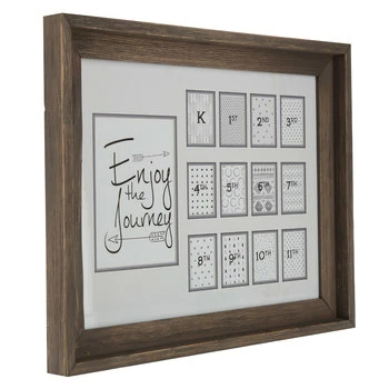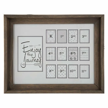 Show off your child’s yearly school photos in style with Enjoy the Journey K-12 Collage Wall Frame. This fun wall piece is housed in a pronounced MDF frame with faux wood texture (glass included). Inside is a printed photo mat in white with gray photo opening borders.