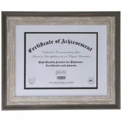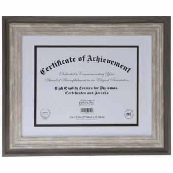 Commemorate your certificate, award, or diploma with an elegant presentation using Gray Beveled Document Frame! This plastic frame boasts a two-toned gray beveled front, a clear glass screen, a layered white mat with a black fillet, and an MDF photo back. Fill out your room or office with a professional addition!