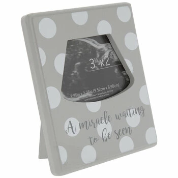 Celebrate your upcoming baby with an adorable frame to preserve your first visual memories. Gray Polka Dot Sonogram Frame features a gray and white polka dot pattern. The photo opening features a clear acrylic screen and the frame opening is shaped like a standard sonogram. Display this frame on your desk, dresser, mantel, and more!