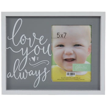 Don’t keep heartfelt memories locked away in your memory vault! Bring them out to share Love You Always Wood Frame! Constructed of MDF, this pretty frame offers a gray and white finish with “Love You Always” in decorative white text with a heart design. Insert your favorite photograph behind its protective glass screen and display it proudly!