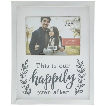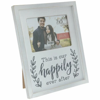 Showcase an engagement or wedding photo in this lovely tabletop frame! Our Happily Ever After Wood Frame is made of MDF and features a distressed, bright-white finish with raised border edges.