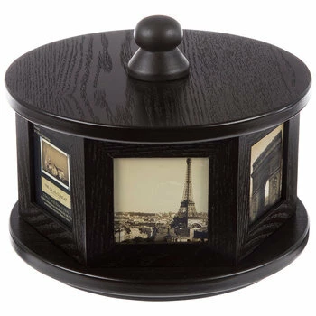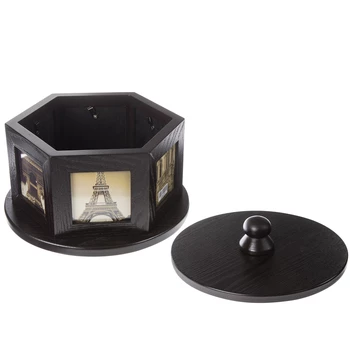 Add a beautiful, functional accent to your interior with Revolving Container Wood Collage Frame! This MDF container has a dark walnut finish and is shaped like a hexagon contained within two circles. It spins around like a Lazy Susan, allowing you to admire the photo you’ve placed in each side. Remove the lid, and you’ll find a hexagonal space for containing small objects!