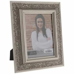 Fill your home with photos of cherished memories, friends, family, and more! Silver Ornate Scroll Frame boasts a plastic frame with detailed bevels, a floral scroll pattern, and an MDF photo back. Plus, its clear glass screen will display and protect your chosen photo. Set it out on a shelf or a mantel for a fantastic way to fill your space with sentiment!