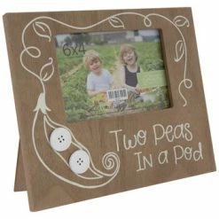 Display the happiest memory of your adorable little ones in Two Peas In A Pod Wood Frame. Boasting white wooden buttons, a white vine of leaves flourishing around the frame opening, and text that reads “two peas in a pod” in white, this home-style MDF frame will add a touch of childhood innocence to a room. Insert your favorite photo and display it on a shelf, bookcase, or dresser!