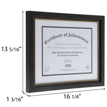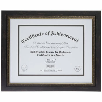 Commemorate your certificate, award, or diploma with an elegant presentation using Two Tone Document Frame! This plastic frame boasts a black, wood-look exterior with brown distressing, a burnished metallic gold outline, a clear glass screen, a layered white mat with a black fillet, and an MDF photo back. Fill out your room or office with a professional addition!
