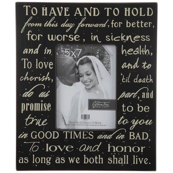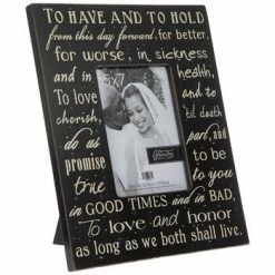 Your wedding day may be over, but the memories last a lifetime! Showcase your special day in this Wedding Vows Wood Frame. Constructed from MDF and completed with a glass front, this black frame has a lightly distressed surface and has text from wedding vows written on it, with words in various fonts. Display this frame anywhere to show off your favorite memory!