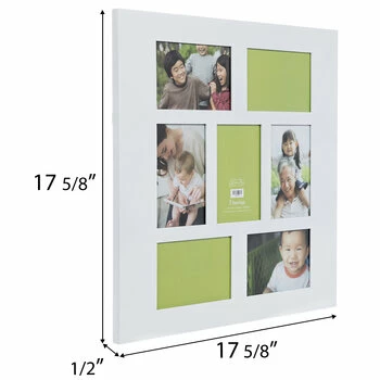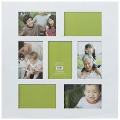 Take the time to artistically display your most treasured memories! White Wood Collage Wall Frame is made of MDF and glass in a square shape. There is a white frame with seven photo openings between two rows. The top row has two horizontal openings, the middle row has three vertical openings, and the bottom row has two horizontal openings.Β Place your photos inside, and hang it up for all to see!