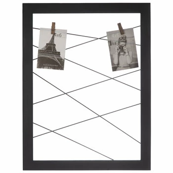 Show off the memories that matter most using Wire Clothespins Clip Collage Wall Frame. This darling frame offers an MDF frame with a rich black surface, metal wire pieces crossed to add visual texture, and wood clothespins for attaching photographs to the wires. Clip photographs, mementos, and more on this pretty frame!
