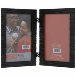 Display your memories with style! Woven Metal Collage Frame features two frames that are joined by a hinge and can be displayed at an angle. Both frames are made of metal in a shiny finish. The frames feature embossed horizontal lines that are uneven for a woven effect. Set your photos behind the glass, and rest this on a counter or shelf!